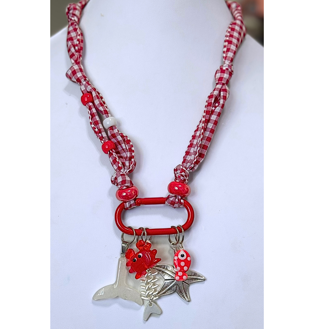 Collar creado con tela en cuadritos rojos y blancos. tiene un conector en metal rojo de donde le cuelgan varios pendants en acrílico, cristal, stainless steel y cerámica con tema marítimo. Lleva una extensión de 3".
